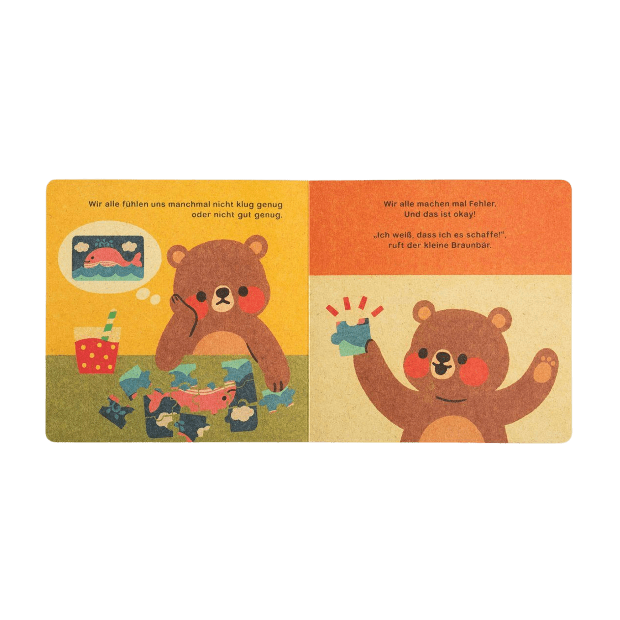 Eine illustrierte Doppelseite aus "Fehler machen ist ok" von Annelies Draws in Retro-Stil zeigt links einen Braunbären, der mit einem Puzzle kämpft, und rechts den gleichen Bären, der glücklich ein Teil in der Hand hält.