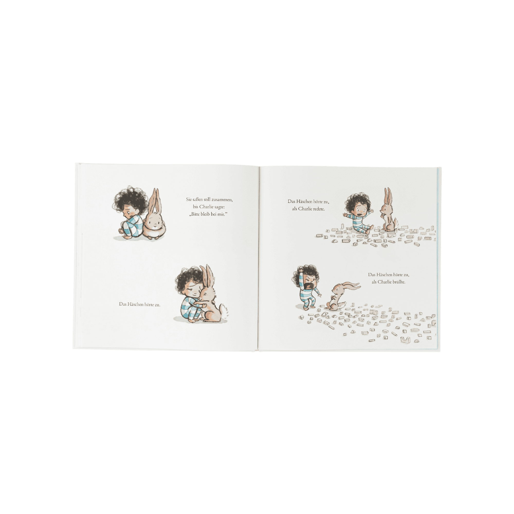 Charlie baut einen Turm aus Bauklötzen, doch plötzlich stürzt er ein! Oh weh! Ein Freund nach dem anderen probiert das Kind aufzumuntern, doch nichts hilft. Bis ein kleiner Hase auftaucht und sich still dazu setzt – und Charlie all die Gedanken und Gefühle ordnen kann...